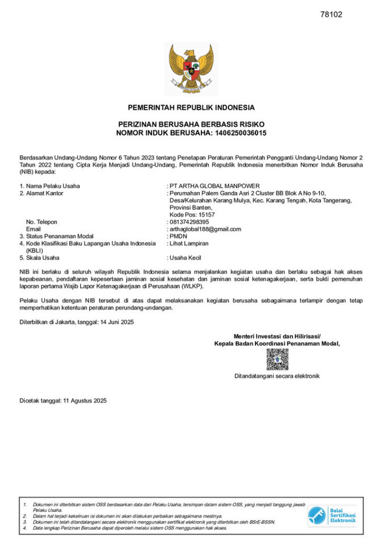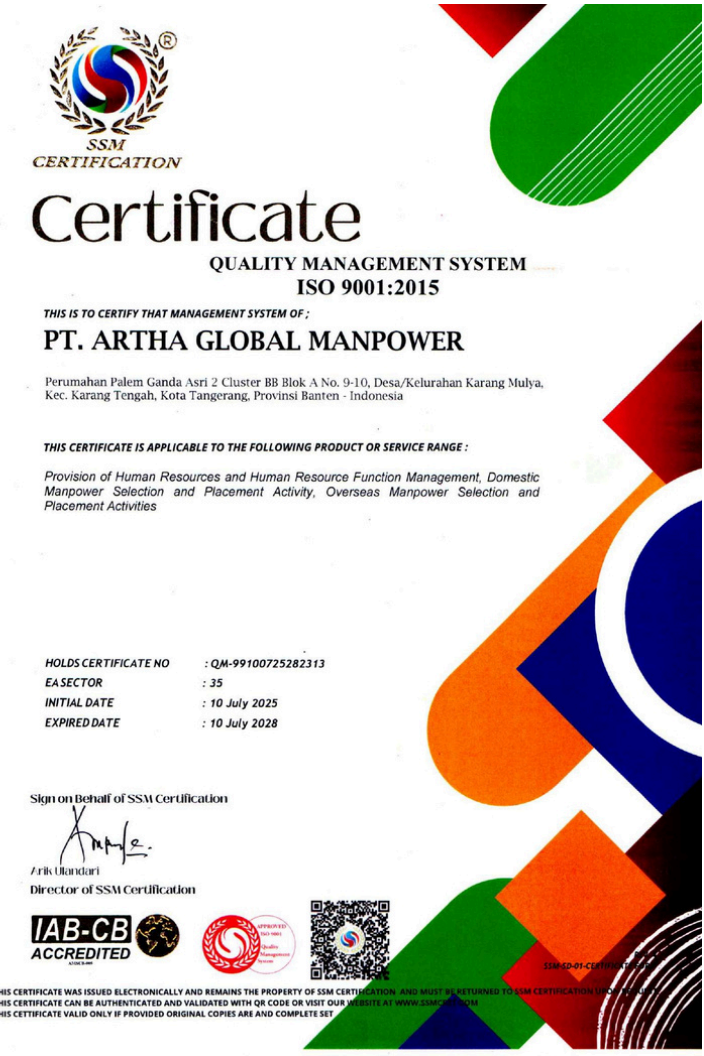 Artha Global Manpower is an officially licensed company engaged in the placement and protection of Indonesian Migrant Workers (PMI) abroad. As a certified P3MI registered under the Ministry of Manpower, we provide professional, transparent services that prioritize worker safety and welfare.
